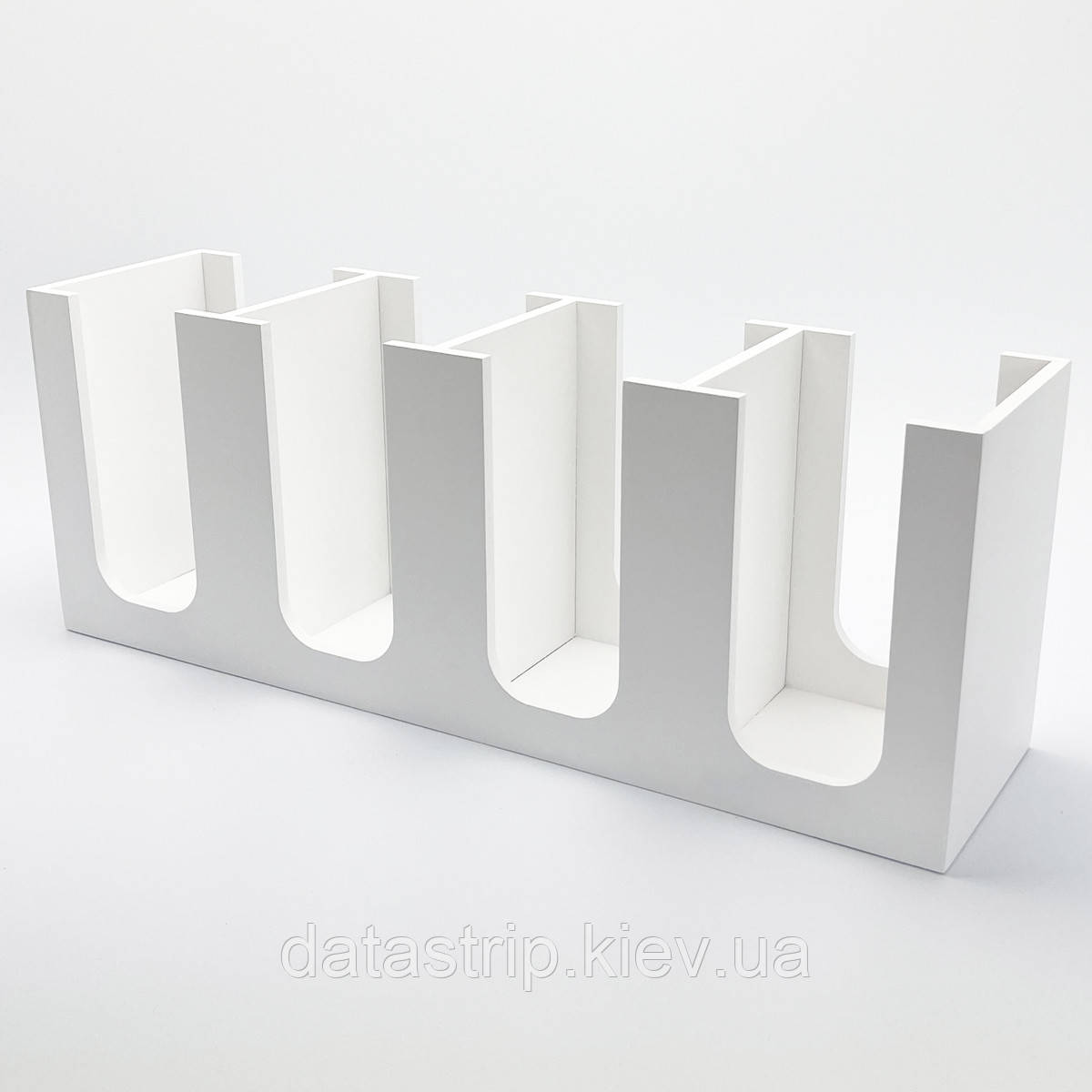 Якісний барний інвентар чекає на вас в асортименті нашого інтернет-магазину “DATASTRIP”. Ми є рекламно-виробничою компанією (виробляємо вироби з міцних та легких матеріалів – акрилу, дерева, пінопласту). У нас ви можете купити якісні барні організатори, серед яких Барний організатор для склянок, кришок на 4 секції. Колір виробу — білий. Зовнішні параметри складають: ширина 11 см, загальна довжина 43 см, висота 16 см.